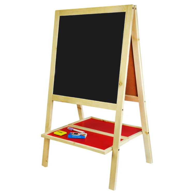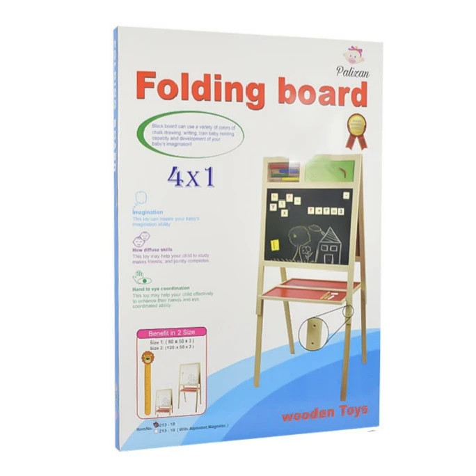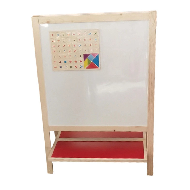 تخته چوبی دورو با 4 پایه جهت افزایش ارتفاع پایه و مطابق نیاز شما ساخته شده است که امکان آموزش به کودکان هم با ماژیک وایت برد و هم با گچ و ابزار مغناطیسی از جمله حروف الفبای فارسی و تخته پاک کن و چرتکه را دارد . این محصول قابل تنظیم ارتفاع و مناسب قد کودکان شما می باشد.