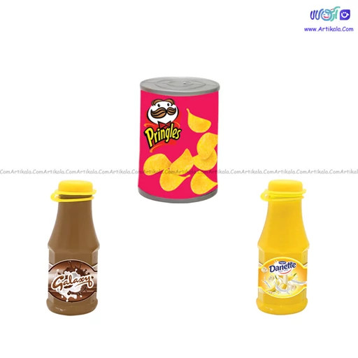 ابزار و وسایل موجود اسباب بازی صندوق فروشگاه شامل:شیرکاکائو ٫شیرموز٫ چیپس شکلات٫ پول های کاغذی و سکه ای ٫دستگاه بارکد خوان