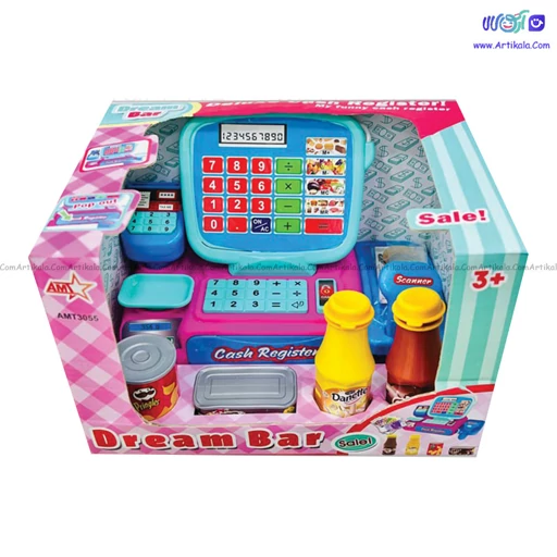 ابزار و وسایل موجود اسباب بازی صندوق فروشگاه شامل:شیرکاکائو ٫شیرموز٫ چیپس شکلات٫ پول های کاغذی و سکه ای ٫دستگاه بارکد خوان