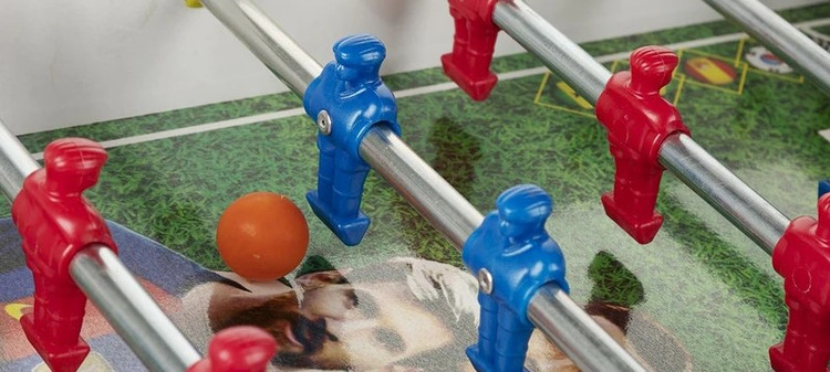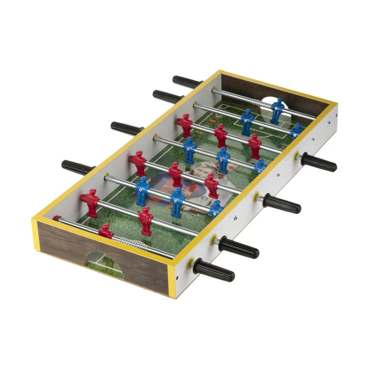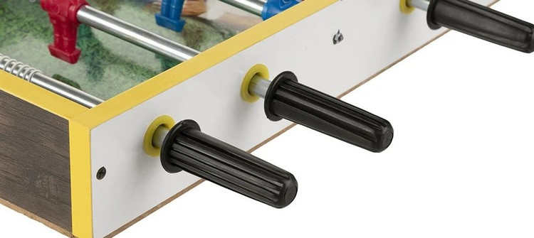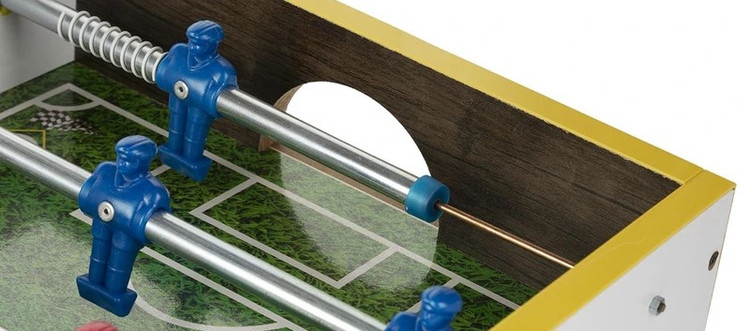 این اسباب بازی دارای توپ های بازی می باشد که از جنس پلاستیک فشرده می باشد. این بازی را می توان دونفره و یا حتی ۴ نفره بازی کرد. هر دسته دارای روکش پلاستیکی میباشد. این اسباب بازی دارای بسته بندی خاصی نمیباشد و محصولی ساخت ایران می باشد. این اسباب بازی برای پسران بسیار هیجان انگیز خواهد بود و حداقل باید دو نفر باشند که هر یک در یک سمت فوتبال اسباب بازی مینشینند و بازی می کنند. هر بازیکن باید رنگ مورد علاقه خود را انتخاب کنند که دو رنگ قرمز و آبی می باشد .این فوتبال چوبی دارای ۱۸ بازیکن می باشد که در دو رنگ قرمز و آبی شش عددی برای هر تیم میباشد. بازیکن ها بروی میله های فلزی قرار متصل شده اند که هر تیم یک دروازه بان، دو دفاع و سه بازیکن حمله دارند. جنس بازیکن ها از پلاستیک فشرده می باشد. زمین فوتبال از لمینت میباشد و ارتفاع دیواره ها حدود ۷ سانتیمتر است.