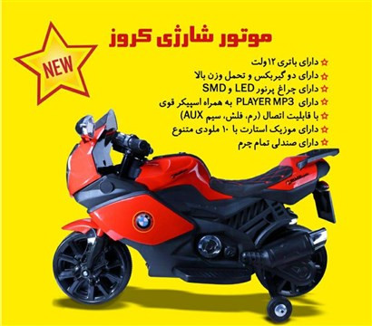 کودکان معمولا علاقه زیادی به ماشین و موتور دارند. برای کودکان انواع مختلفی از اسباب بازی های این وسایل ساخته شده است که یکی از آن ها، موتور شارژی است. این وسیله شباهت زیادی به موتورسیکلت واقعی دارد به همین دلیل از وسایل محبوب بین کودکان به شمار می روند.این موتور کودک از نوع شارژی است که از دو موتور بهره میبرد. تحمل وزن تا 30 کیلوگرم و دارای چراغ جلو و قابلیت تعویض باطری دارد.در مرحلهی اول برای شارژ این باتری، به 18 ساعت زمان نیاز دارید. پس از شارژ کامل باتری، موتور به مدت 1 تا 2 ساعت، انرژی حرکت خواهد داشت؛ اما نگران نباشید برای مراحل بعدی شارژ، تنها به 8 تا 12 ساعت زمان احتیاج دارید. موتور شارژی در دو رنگ سفید و قرمز تولید گردیده است و میتوانید متناسب با سلیقهی کودکتان، یکی را تهیه کنید تا از بازیکردن لذت ببرد.برای حرکت این موتور شارژی کافی است آن را روشن کرده و توسط دکمهی قرارگرفته در کنار موتور، جهت حرکت آن را مشخص کنید و پدال را فشار دهید تا موتور با حداکثر سرعت 3 تا 4 کیلومتر بر ساعت به حرکت درآید. برای قرارگرفتن پاهای کودک حین حرکت، دو جاپایی تعبیه شده است. برای ایستادن موتور با رهاکردن گاز، در جلوی جاپایی سمت راست، پدال ترمز قرار گرفته است که بهصورت کاملا ابتدایی و مکانیکی، چرخ عقب موتور را از حرکت نگهمیدارد. برای استفادهی کودکانی که نمیتوانند تعادل خود را روی موتور حفظ کنند، دو چرخ کمکی در طرفین چرخ عقب وجود دارد. چرخهای موتور شارژی از لاستیکهای توپر هستند. از ویژگیهای این نوع لاستیکها میتوان به پنچرنشدن آنها اشاره کرد و همینطور به بادکردن هم نیازی ندارند. روکش زین موتور از جنس چرم مصنوعی است و سواری راحتتری را برای کودک به ارمغان میآورد. این موتور سایز بزرگ بوده و دارای دو باتری ، صندلی چرم و چرخ ها چراغدار جذاب و فلش خور می باشد که این ویژگی ها شادی و نشاط کودکان را به اوج می رسانند.