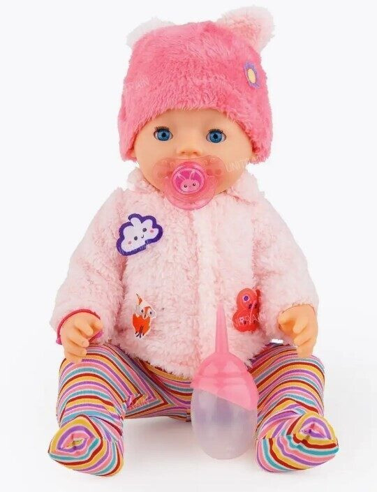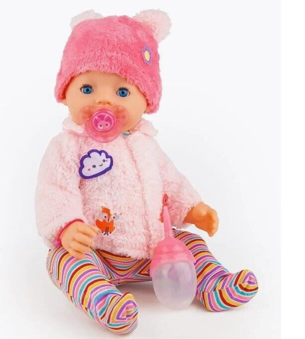 این عروسک می تواند از یک بطری بنوشد. این مجموعه شامل یک کاسه است که می توانید از آن به کودک نوپا غذا دهید و یک پوشک برای تعویض پوشک (عروسک عملکرد ادرار نیز دارد، اما برای این کار لازم است ابتدا یک بطری آب بنوشید). دست ها و پاها کاملاً متحرک هستند و خود عروسک می تواند بایستد یا بنشیند. خود عروسک از مواد جامد ساخته شده است که به او اجازه می دهد در آب واقعی حمام کند.با موهای ابریشمی ضخیمش که می توان با برس همراهش شانه کرد، شایان ستایش است. عروسک لباس خنده دار با کلاه پوشیده است (عروسک را می توان درآورد) و همچنین می توانید کفش پوشاند بهش. کودک با بازی با یک عروسک حس همدلی و مسئولیت پذیری را در خود پرورش می دهد